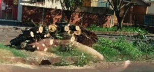 No capítulo anterior você viu que foi preciso chamar uma trator com pá-carregadeira para desenroscar a árvore de uma carreta que passava nesta segunda-feira pela av. Guilherme de Paula Xavier. No capítulo de hoje, eis quem pagou o pato na história: a árvore, que foi derrubada. Mais uma!