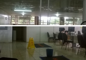 "Situação de parte do prédio do Detran de Campo Mourão nesta segunda-feira, às 11h, dois dias depois do fim da chuva. Onde está a preocupação dos gestores com a saúde e, principalmente, com a segurança dos usuários e funcionários?"
