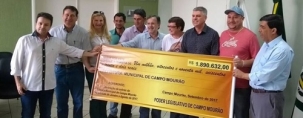Nove dos 13 vereadores de Campo Mourão estiveram nesta segunda-feira no gabinete do prefeito Tauillo Tezelli. Foram levar um "checão simbólico" de R$ 1,8 milhão. É o valor que a Câmara poderia ter gastado, se quisesse, mas não gastou. A devolução é simbólica porque o dinheiro não chegou a sair da prefeitura. O vereador Edilson Martins disse que até o fim do ano a economia deve chegar a R$ 2,5 milhões. Tauillo informou que tudo o que a Câmara deixa de gastar está sendo usado para tapar buracos.