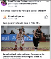 Campo Mourão Basquete anunciou na semana passada que pretende renovar com seis ou sete jogadores do elenco da última temporada. Os nomes não foram revelados, mas o capitão Cauê não é um deles. Nesta quinta-feira o ex-capitão de Campo Mourão postou nas redes sociais que está "voltando pra casa". Ele acertou com o Caxias do Sul/RS. Cauê é o segundo que confirma contrato com outro time. O primeiro foi Betinho, contratado pelo Basquete Cearense, de Fortaleza/CE.