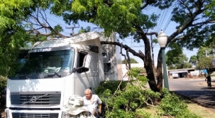 "Carreta quebra o galho de árvore de rua, que cai sobre a cabine. A cena é desta quarta-feira, na av. Jorge Walter, em frente ao supermercado Paraná!".