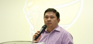 Edson "China" Hirata, presidente da Amobasquete, destacando a primeira participação de Campo Mourão no NBB, com sucesso dentro de fora das quadras; durante evento que lançou o projeto para a disputa da próxima temporada; semana passada.