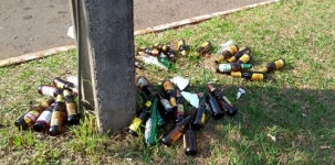 Garrafas de cerveja foram deixadas no canteiro central da av. Comendador Norberto Marcondes, perto da Casa da Cultura. Que feio!...