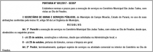 A prefeitura definiu os prazos para melhorias em túmulos visando o Dia de Finados. Construções e reformas podem ser feitas até 25 de outubro. Pinturas e limpezas até dia 29.