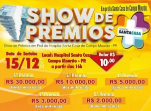 A Santa Casa de Campo Mourão confirmou a realização de mais um Show de Prêmios para este fim de ano. Será no dia 15 dezembro, com o objetivo de ajudar a pagar o 13.o salário dos funcionários. Serão sorteados R$ 50 mil, dividos em cinco prêmios - R$ 30 mil para o primeiro prêmio, R$ 10 mil para o segundo, R$ 5 mil para o terceiro, R$ 3 mil para o quarto e R$ 2 mil para o quinto. A cartela custa R$ 10.