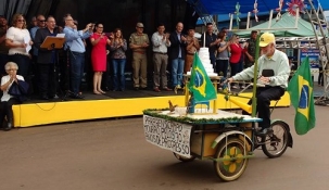 Frase colocada em cartaz na bicicleta de seo Daniel Gonçalves, de 78 anos, que todo ano participa dos desfiles de Campo Mourão. Ele vai no Sete de Setembro e no aniversário da cidade, em 10 de outubro. Nesta terça-feira não poderia ser diferente. Levou bolo e tudo na "magrela" de três rodas. Foi aplaudido pelo público e pelas autoridades.