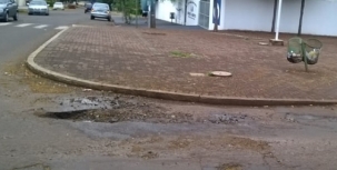 "Rua São José, esquina com com av. Jorge Walter. Reapareceu o buraco que estava esperando a próxima chuva".