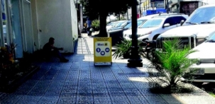 "Placa atrapalhando o trânsito de pedestre, na rua São Paulo, perto do Banco do Brasil".