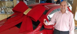 Dirceu Jacob de Souza, advogado, ao receber o Ford Ka 0 km que ganhou a promoção "Campo Mourão Cidade Natal". da Acicam. Ele foi sorteado com seladinha que recebeu por compra no Paraná Supermercado; nesta sexta-feira, na Paranavel, onde foi feita a entrega do Ka e das três motos Suzuki.