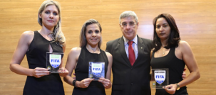 Edna Alves, árbitra de futebol, de Goioerê, ao receber a insígnia da Fifa; nesta terça-feira, em solenidade na CBF, no Rio de Janeiro. Primeira à direita na foto, Edna está pré-selecionada para a Copa do Mundo Feminina de 2019, na França.