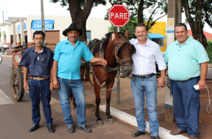 Sim. Quem aparece aí "meio" que abraçado ao cavalo é o prefeito de Goioerê, Pedro Coelho. Ele foi conferir melhorias feitas na Praça dos Carroceiros, como na iluminação e no parquinho. O cavalo é do carroceiro Valdivino José da Cruz, de 65 anos, que este ano completa 50 anos trabalhando fazendo frete com carroça.