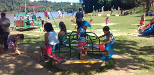 Adultos sentam em brinquedo do novo parquinho infantil do Parque do Lago. Pudera. Não existem bancos no local.