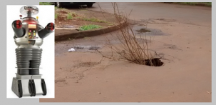 "Escola Parigot de Souza, na rua Mato Grosso. O chão se abriu bem onde as crianças atravessam a rua para chegar à escola. O ônibus do transporte escolar também passa por ali". Os sensores ro Robô alertam para o perigo.