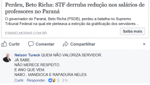 O blogueiro Esmael Morais postou nesta quinta-feira nota sobre derrota do governador Beto Richa no STF, em ação que questionava o fim de gratificação a servidores do Estado. A informação foi parar no Facebook e olha só o comentário feito pelo ex-prefeito Nelson Tureck. Deuzolivre!...