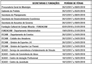 A prefeitura publicou novo decreto nesta terça-feira sobre as férias coletivas neste fim de ano e início de ano novo. Houve algumas alterações em relação ao decreto de sexta-feira, que foi revogado. O novo incluiu o Gabinete do Prefeito, que para de 26 de dezembro a 5 de janeiro (só que haverá plantão). Os setores da prefeitura terão dias e períodos diferentes de férias coletivas.