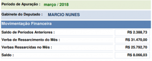 Saiu o relatório de despesas de março dos gabintes dos deputados estaduais. No caso do mourãoense Márcio Nunes, ele continua econômico em 2018. Foram ressarcidos apenas R$ 25,7 mil dos R$ 31,4 mil de direito de cada parlamentar. Como já havia sobras de outros meses, março terminou com R$ 8 mil em caixa. A partir de abril a divulgação vai incluir o deputado Douglas Fabrício, que voltou à Assemblelia Legislativa.