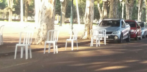 "Não são só comerciantes que reservam vagas de estacionamento no centro de Campo Mourão. Órgão público também".