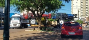 Carreta fica "enroscada" no centro de Campo Mourão. Foi na manhã desta segunda-feira, na av. Capitão Índio Bandeira, próximo a rua Rocha Pombo.