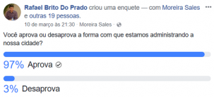 O prefeito de Moreira Sales, Rafael Bolacha, foi no mínimo corajoso. Colocou no Facebook uma enquete para saber se os moradores aprovavam ou não seu jeito de administrar. Correu um risco danado dos adversários tomarem conta, mas não foi isso que aconteceu. A poucas horas do fim da votação, 97% dos votos eram pela aprovação. Só 3% votaram desaprovando. Ufa!...