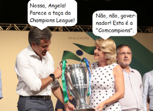A presidente da Comcam, Angela Kraus (Farol), aproveitou a presença do governador Beto Richa no Teatro Municipal, em evento sobre esporte, e apresentou a ele a taça da Copa Comcam Sicredi. É "orelhuda" igual a taça da Champions League, mas só parece. Digamos que é a "Comcampions"...