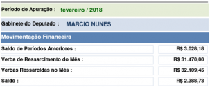 Saiu o relatório de fevereiro das despesas dos gabinetes dos deputados estaduais. O mourãoense Márcio Nunes fechou o mês com R$ 2,3 mil no caixa. Em janeiro as "sobras" tinham sido de R$ 3 mil. Pela regras da Assembleia Legislativa, cada deputado tem R$ 31,4 mil mensais para bancar as despesas de gabinete.