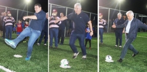 A prefeitura de Barbosa Ferraz inaugurou nesta quinta-feira a mini-arena multiuso "José Roldão" e a academia ao ar livre. O prefeito Edenilson Miliossi e os deputados Douglas Fabrício e Rubens Bueno deram seus chutes a gol. Bueno marcou sobre o goleirão, o vereador Marcos Balada. Outros seis vereadores participaram. Olha aí, o Tite é que não soube levar os homens certos pra Rússia...