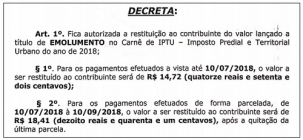 O ressarcimento está previsto em decreto do prefeito Rafael Bolacha.