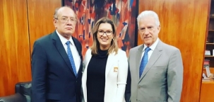 A mourãoense Sueli Bissi esteve nesta quarta-feira com o ministro Gilmar Mendes, do Supremo Tribunal Federal. Ela é chefe de Cartório Eleitoral em Campo Mourão e participou da audiência como representante do Sinjuspar. Em pauta, a luta contra cortes de benefícios de servidores das justiças Estadual, Federal e do Trabalho. O deputado federal Rubens Bueno acompanhou a reunião.