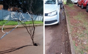 1) Galho sinaliza buraco no meio da rua ao lado da Associação dos Agrônomos, no jardim Albuquerque.