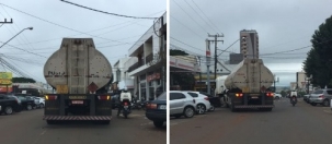 "Caminhão de combustível travando o trânsito ao meio dia no centro de Campo Mourão".