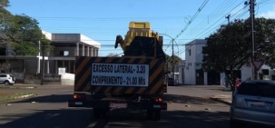 Ficar parado no trânsito porque um carreta carregando uma colheitadeira resolve passar pelo centro de Campo Mourão. A foto é na rua Interventor Manoel Ribas.
