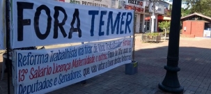 Um grupo (pequeno) de sindicalistas e de estudantes protesta nesta sexta-feira pela manhã no calçadão de Campo Mourão. É contra as propostas de reforma trabalhista e da Previdência do presidente Michel Temer. O protesto inclui faixas, panfletos e músicas com paródias sobre a situação política do País. A "greve geral" fechou as agências bancárias de Campo Mourão, mas elas devem funcionar depois do meio-dia.