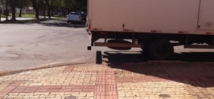 Na rua Rocha Pombo, esquina com av. Manoel Mendes de Camargo, caminhão para na esquina, em local proibido, e ainda tranca a passagem da rampa para cadeirantes.