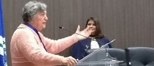Walkyria Gaertner Boz, professora, autora da música do Hino de Campo Mourão, ao discursar após receber a Comenda Vida & Liberdade da Academia Mourãoense de Letras, neste sábado. Ela morou na cidade de 1963 a 1971.