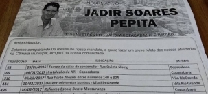 O vereador Jadir Pepita está prestando contas dos primeiros seis meses do mandato. Um panfleto mostra os pedidos feitos por ele no período e o que foi atendido. Destaque para tapa-buracos e para a reabertura do contraturno na escola Manoel da Nóbrega, no Km 128.