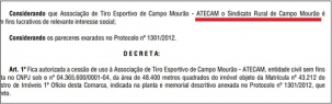 O decreto que cedeu área na vila Guarujá para a Associação de Tiro Esportivo de Campo Mourão teve caso típico de "ctrl C ctrl V". O texto tá falando da Atecam e, de repente, não mais que de repente, vira "Sindicato Rural". Isso saiu no "Órgão Oficial" de terça-feira. Nesta quarta-feira a prefeitura republicou com a devida correção. Ah, quem nunca usou o "copia e cola" que atire a primeira pedra...