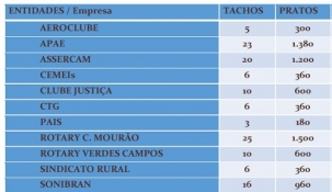 Mais tachos - 130 foram os tachos vendidos pela entidades. Incluindo degustação na praça, tachos de reserva e o pessoal que estava trabalhando na festa, foram preparados 148 tachos.