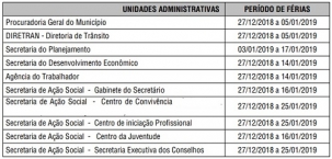 A prefeitura definiu como serão as férias coletivas em seus mais variado departamentos nem fim de ano e início de ano ano. A maioria para no Natal e volta só em 2019. Uns setores retornam dia 5, outros dia 14, outros dia 16, outros dia 17 e outros dia 25. A Fundação Cultural para em janeiro inteiro e a Fundação de Esportes para basicamente de 27 de dezembro a 25 de janeiro.