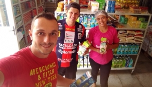 Foto: Luan Moreira (professor de educação física) e Wellington Dolly (diretor de Esportes) repassam água de coco para nutricionista da Santa Casa.