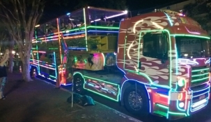 Em "O que tá fazendo aí?" Boca Santa ja mostrou mais de 200 caminhões passando por ruas e avenidas centrais de Campo Mourão. Nenhum, no entanto, tinha tantas luzes como esse. É a Carreta Furacão, que começou nesta terça-feira a dar voltinhas pelo centro, à noite. Cada giro de 15 minutos custa R$ 5. Dá pra levar 120 pessoas por vez.