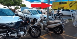 Em supermercado de Campo Mourão, a faixa amarela diz que é proibido estacionar moto neste local.