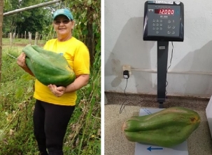 Em Iretama, a agricultora Zenaide Grolla ficou famosa por produzir mamões gigantes. Esse aí é o maior que ela já colheu até agora: 12 kg. Fez até foto na balança para mostrar que não se trata de fake news. Segundo ela, as sementes vieram do México. O mamãozão não é tão doce como o normal, mas dá pra comer, principalmente como salada.