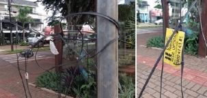 Massaroca de fios amarrados em placa de trânsito na esquina da rua Santa Catarina com a av. Manoel Mendes de Camargo. Tem de tudo, até fio com etiqueta.