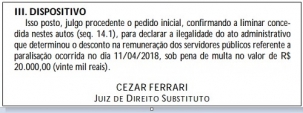 "Logo, demonstrado que a greve foi provocada por conduta ilícita do Poder Público, revela-se incabível o ato perpetrado pelas Autoridades Coatoras de desconto em folha de pagamento dos servidores públicos municipais que participaram da paralisação ocorrida no dia 11 de abril de 2018".