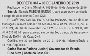 Primeiro saiu no blog Paçoca com Cebola. Depois foi reproduzido no jornal "Impacto". É a nomeação de Rubens Bueno II como assessor da Casa Civil, no Palácio Iguaçu. Portaria devidamente assinada pelo governador Ratinho Jr. O nome não é coincidência, não. Trata-se de filho do deputado federal Rubens Bueno, ex-prefeito de Campo Mourão.