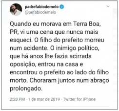 A morte do neto do ex-presidente Lula e algumas postagens infelizes nas redes sociais fez o padre Fábio de Melo relembrar no Twiter uma passagem dele em Terra Boa, onde frequentou o o seminário. Fábio de Melo não citou nomes, mas o prefeito de Terra Boa que perdeu filho em acidente foi Caião Rampazzo. O adversário, que também foi prefeito, era Elso Garcia Segura.