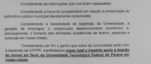 Dezoito entidades divulgaram nota em apoio à doaçãoo de terreno para ampialção da UTFPR de Campo Mourão.