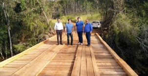 Foi reconstruída a ponte de madeira sobre o rio Formoso, na divisa de Iretama e Luiziana. Como é de praxe, as duas prefeituras se uniram na obra. Fizeram o popular "rachide" para bancar os custos. Os prefeitos Wilson Bratac (Iretama) e Mauro Slongo (Luiziana) foram juntos conferir o trabalho. Olha aí, com o peso deles aguentou bem...