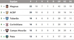 Campo Mourão está em quinto lugar,com 15 pontos, enquanto o Pato é sexto, com 13.