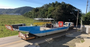 Sim, é ela, a balsa que vai trabalhar no rio Piquiri, na estrada que liga Campina da Lagoa e Guaraniaçu. Saiu da fábrica, em Navegantes/SC. Custou cerca de R$ 590 mil. A maior parte foi bancada pelo governo do Estado, mas teve aditivo da prefeitura. A balsa foi batizada de "Zé Moreno", que foi prefeito de Nova Cantu, mas morava em Campina da Lagoa quando morreu, em 2017.